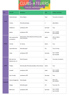 Des clubs et activités ont lieu entre 13h15 et 14h chaque jour, encadrés par des professeurs volontaires. Parmi ces activités on retrouve l'AS (sur adhésion), le club lecture ou manga, la chorale, la sieste musicale... Voir fichier ci-joint!